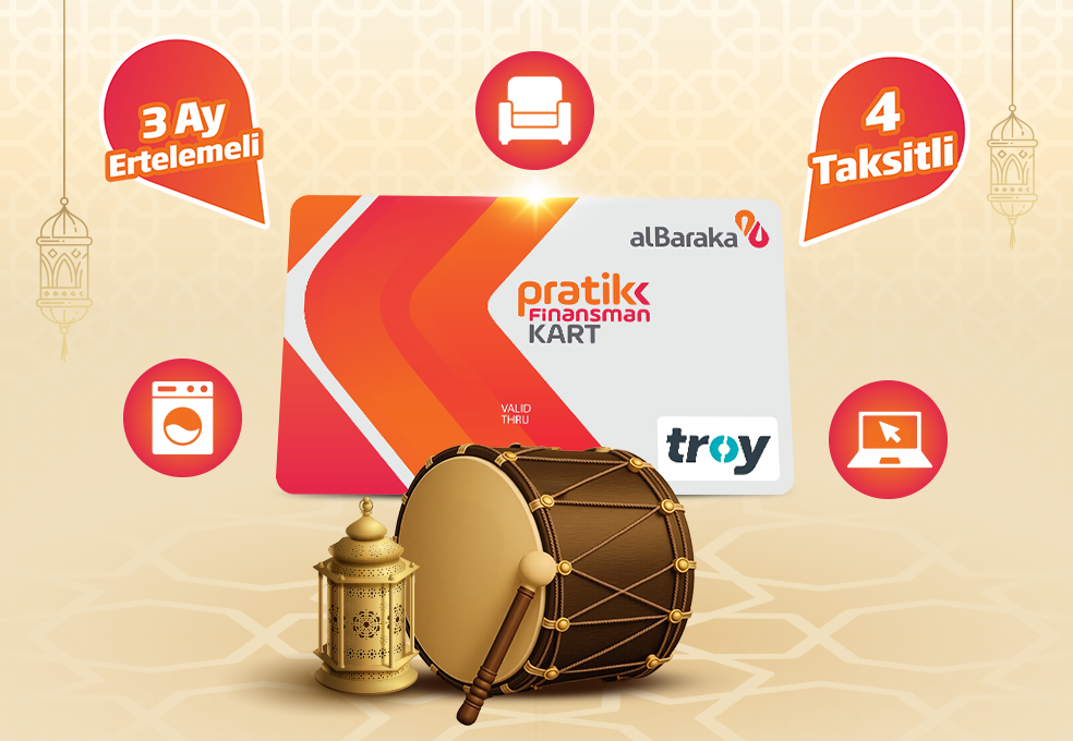 - Pratik Finansman Kart başvurusu olumlu değerlendirilerek onaylanan müşterilerimiz, Albaraka Mobil ve İnternet kanalları üzerinden 3 ay ertelemeli 24 varan vadeli finansman kullanabilecektir.